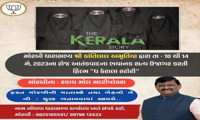 આતંકવાદની ભયાનકતા વિશે ચિત્ર રજુ કરતું ફિલ્મ કેરેલા સ્ટોરી સિનેમા ઘરમાં રીલીઝ થતાની સાથે ભારે ચર્ચાનું કેન્દ્ર બન્યું છ મહિલા અને યુવતીઓ આ ફિલ્મને ખાસ પસંદ કરી રહી છે. મોરબી શહેરની સિનેમા ઘરમાં પણ આ ફિલ્મ રીલીઝ થયુ છે ત્યારે મોરબીમાં ધારાસભ્ય કાંતિભાઈ અમૃતિયા દ્વારા આગામી 10થી 14 એમ દરમિયાન 18વર્ષથી વધુ વયની શાળા કોલેજની વિદ્યાર્થીનીઓ તેમજ અન્ય યુવતી માટે નિશુલ્ક શો નું આયોજન કરવામાં આવ્યું છે. આ નિ:શુલ્ક શોનું આયોજન સ્કાય મલ્ટી પ્લેકસ સ્કાય મોલ ખાતે સવાર અને સાંજ સુધીનું આયોજન કરવામાં આવ્યું છે. જે વિદ્યાર્થીનીઓ આ ફિલ્મ જોવા આવવા માંગતી હોય તેમણે આજ તા.9ના રોજ સાંજ સુધીમાં મોબાઈલ નંબર 9825105591 તેમજ 9979613433 ઉપર ફોન કરી રજીસ્ટ્રેશન કરાવવાનું રહેશે.અથવા આપેલ નંબર પર નામ, ઉમર મોબાઈલ, સરનામાં સહિતી વિગત વોટ્રસ એપ પર મોકલી શકાશે શો જોવા માટે રજીસ્ટ્રેશન કરાવવું ફરજિયાત છે જેની ખાસ નોંધ લેવી.