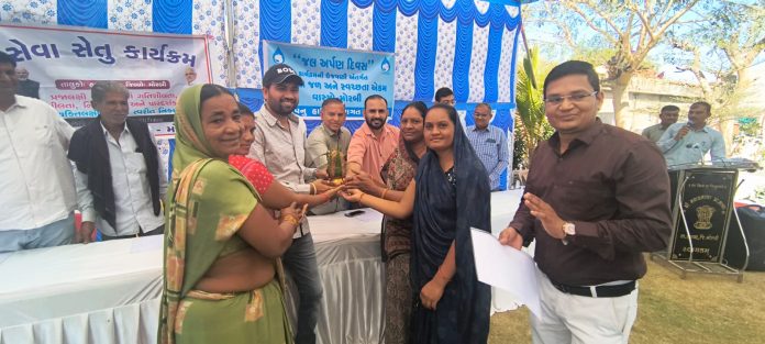 રાજ્યના છેવાડાના માનવી સુધી પાયાની સુવિધાઓ અને વહીવટી પારદર્શિતા પહોંચાડવાના સરકારના સંકલ્પને સાકારે કરવાના ભાગરૂપે મોરબી જિલ્લામાં હળવદ તાલુકાના ઘનશ્યામનગર ગામે ‘જલ અર્પણ દિવસ’, ‘સેવા સેતુ’ અને ‘આરોગ્ય કેમ્પ’ સાથે ત્રિવિધ કાર્યક્રમ યોજાયો હતો. આ કાર્યક્રમ દ્વારા ગ્રામજનોને શુદ્ધ પેયજળની સુવિધા સુપ્રત કરવાની સાથે સાથે વિવિધ સરકારી યોજનાઓના લાભો એક જ સ્થળે ઉપલબ્ધ કરાવી વહીવટી પ્રક્રિયાને વધુ લોકભોગ્ય બનાવવામાં આવી હતી.