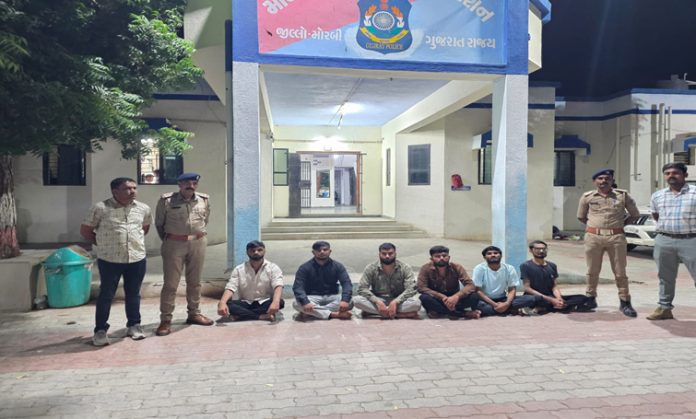 પકડાયેલા આરોપીઓમાં મોહન ઉર્ફે શિવમભાઈ ભગવાનજીભાઈ ભુંભરીયા, રમેશભાઈ ઉર્ફે રામો અરજણભાઈ રબારી (મૂળ કેશોદ, હાલ મોરબી), પુથ્વીરાજસિંહ ભગીરથસિંહ ઝાલા, ગુલામહુસૈન મહેબુબભાઈ પઠાણ, કિશનભાઈ અમરશીભાઈ ચૌહાણ તથા હીરાભાઈ રવજીભાઈ ઉલવા (તમામ રહે. મોરબી)નો સમાવેશ થાય છે. પોલીસે તમામ આરોપીઓ વિરુદ્ધ કાયદેસરની કાર્યવાહી આગળ ધપાવી છે.
